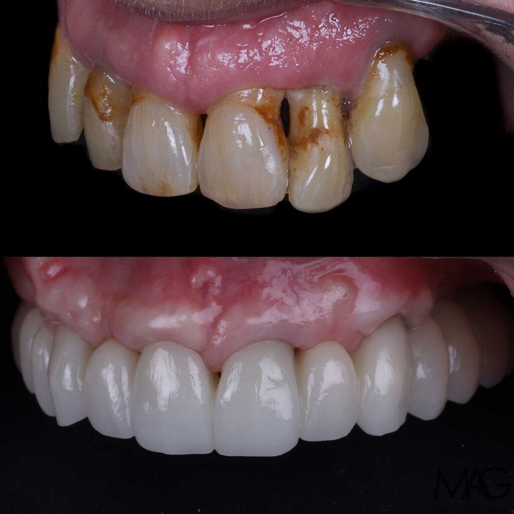 Después de analizar el caso de forma detenida y con diferentes pruebas, decidimos que la solución pasaba por realizar una exodoncia completa de la arcada superior, y rehabilitarla mediante implantes dentales y una prótesis implanto soportada. De esta forma podremos tratar mejor la enfermedad periodontal y recuperar la funcionalidad y estética de la arcada superior.