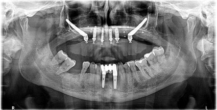 En la siguiente foto se aprecia la ubicación de los implantes Cigomáticos en una radiografía
